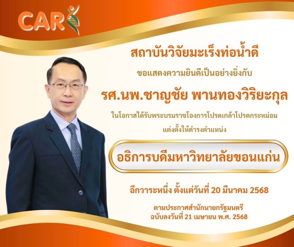 Congratulations to Associate Professor Dr. Chanchai Panthongviriyakul. April 25, 2025 admin 0 ขอแสดงความยินดีเป็นอย่างยิ่งกับ "รศ.นพ.ชาญชัย พานทองวิริยะกุล" สถาบันวิจัยมะเร็งท่อน้ำดี ขอแสดงความยินดีเป็นอย่างยิ่งกับ “รศ.นพ.ชาญชัย พานทองวิริยะกุล” ในโอกาสได้รับพระบรมราชโองการโปรดเกล้าโปรดกระหม่อม แต่งตั้งให้ดำรงตำแหน่ง “อธิการบดีมหาวิทยาลัยขอนแก่น” อีกวาระหนึ่ง ตั้งแต่วันที่ 20 มีนาคม 2568 เป็นต้นไป ตามประกาศสำนักนายกรัฐมนตรี ฉบับลงวันที่ 21 เมษายน พ.ศ. 2568 >> Read More