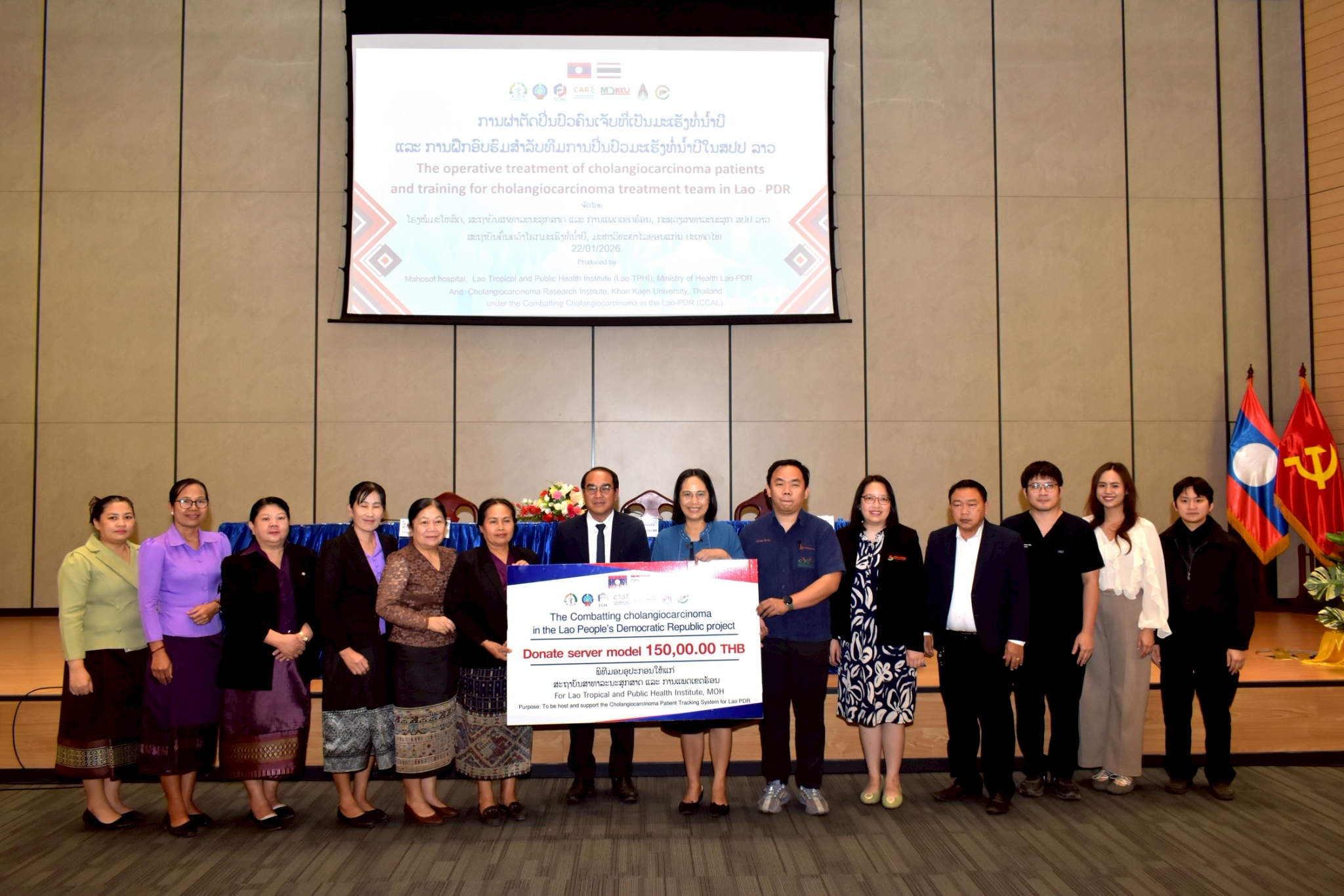 On January 22, 2026, the Cholangiocarcinoma Research Institute, in collaboration with Mahosot Hospital and the Lao PDR Institute of Public Health and Tropical Medicine (Lao TPHI), organized a surgical treatment program for cholangiocarcinoma patients and training for cholangiocarcinoma treatment teams in Lao PDR. A server model was also provided for a system to collect and monitor cholangiocarcinoma treatment in Lao PDR under the Combatting Cholangiocarcinoma in the Lao PDR project, supported by the Mekong-Lancang Cooperation Special Fund. The event took place at Mahosot Hospital, Vientiane, Lao PDR.